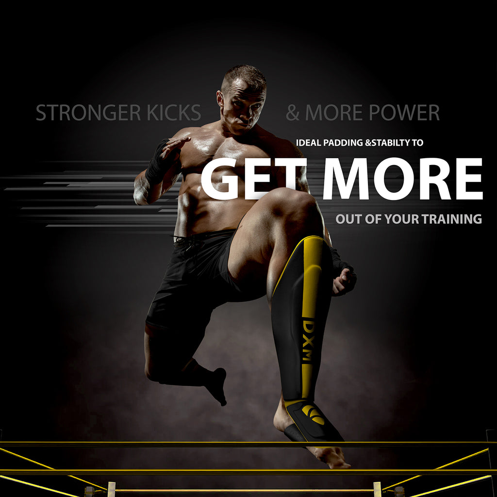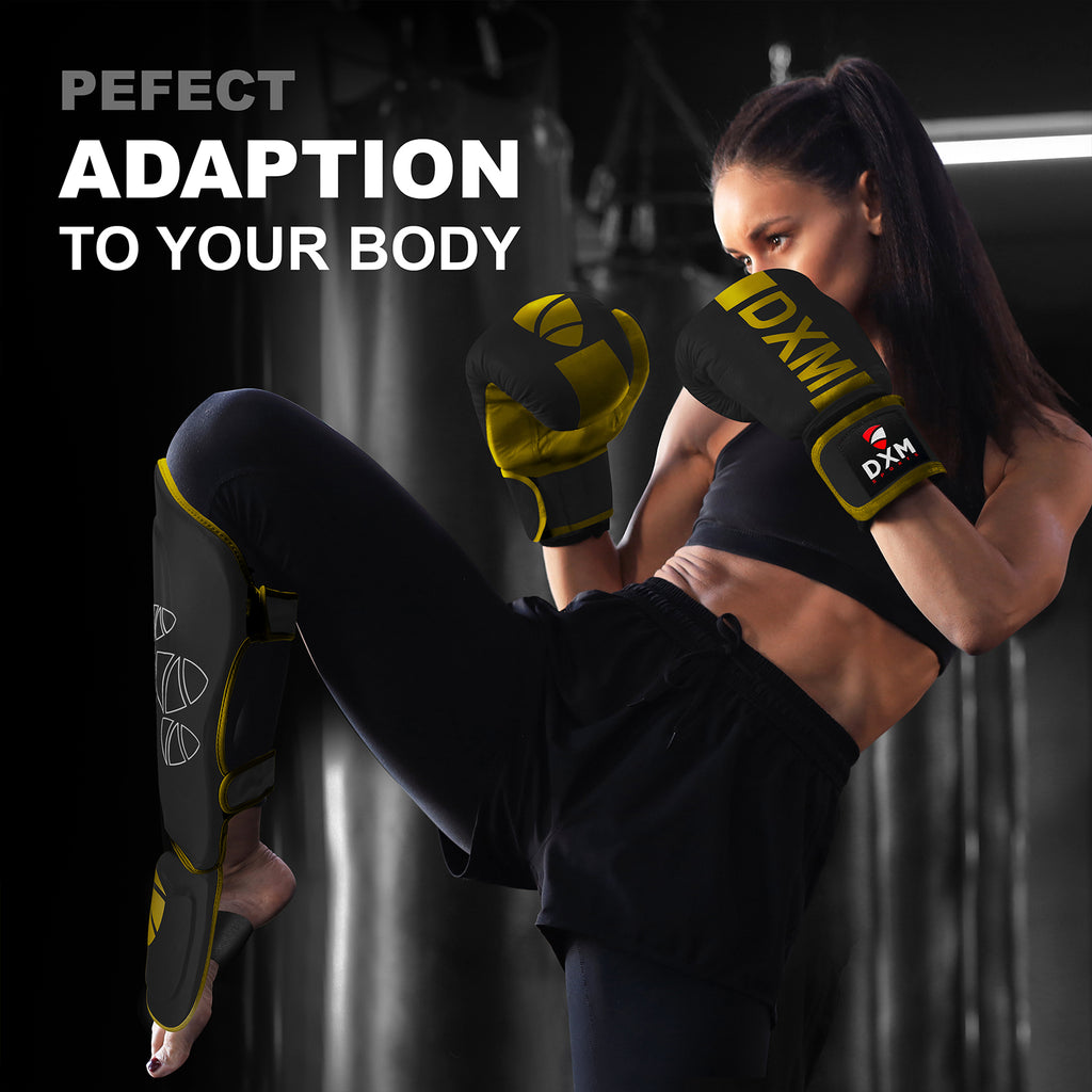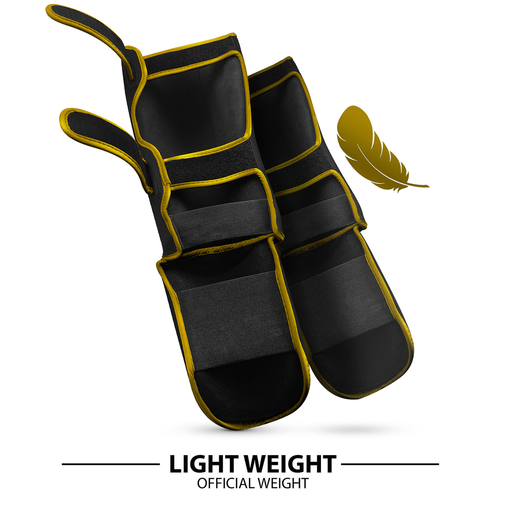 DXM Sports Espinilleras de Empeine Negras/Oro para Artes Marciales MMA Equipo de Entrenamiento de Patadas y Sparring, BJJ Karate Boxeo Taekwondo