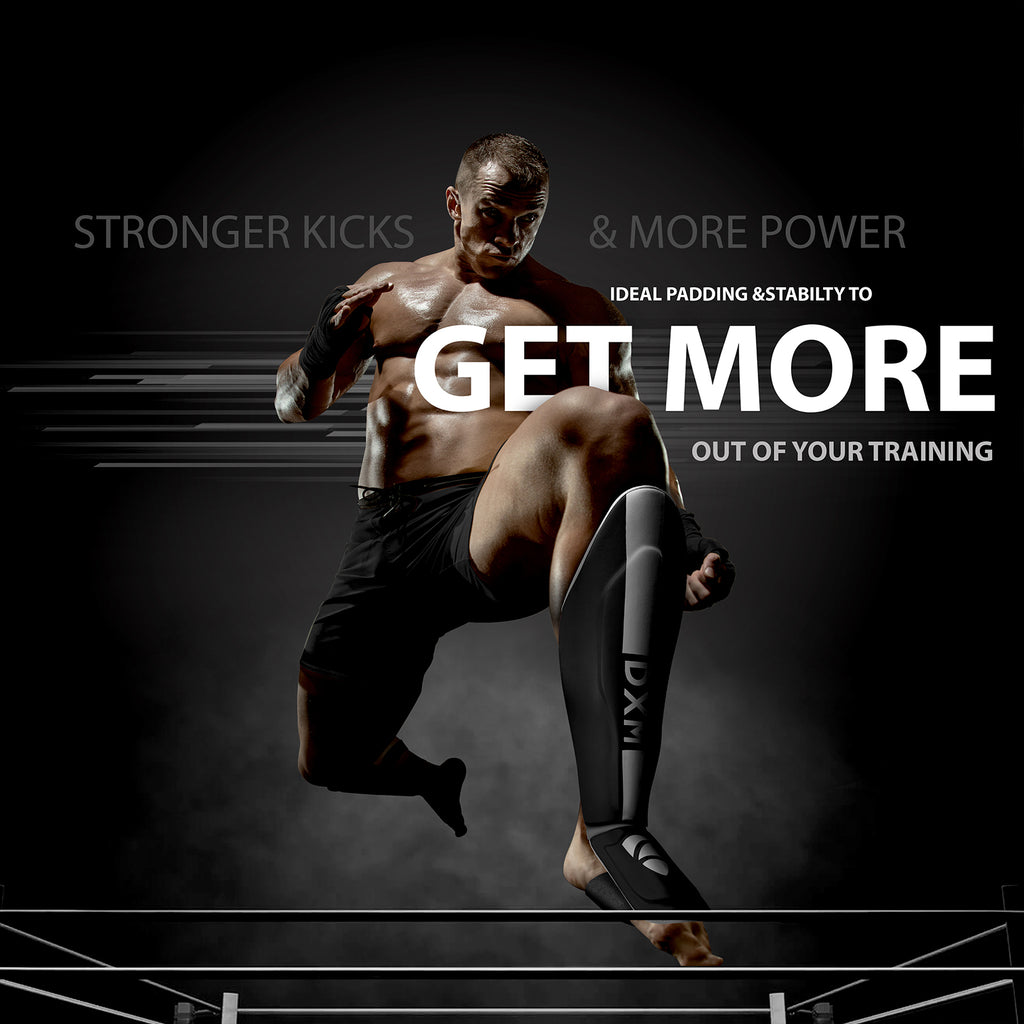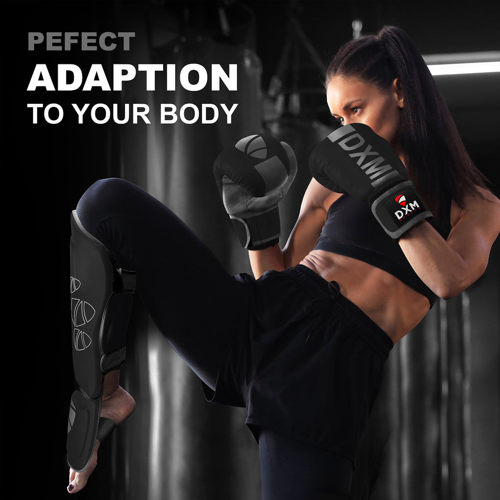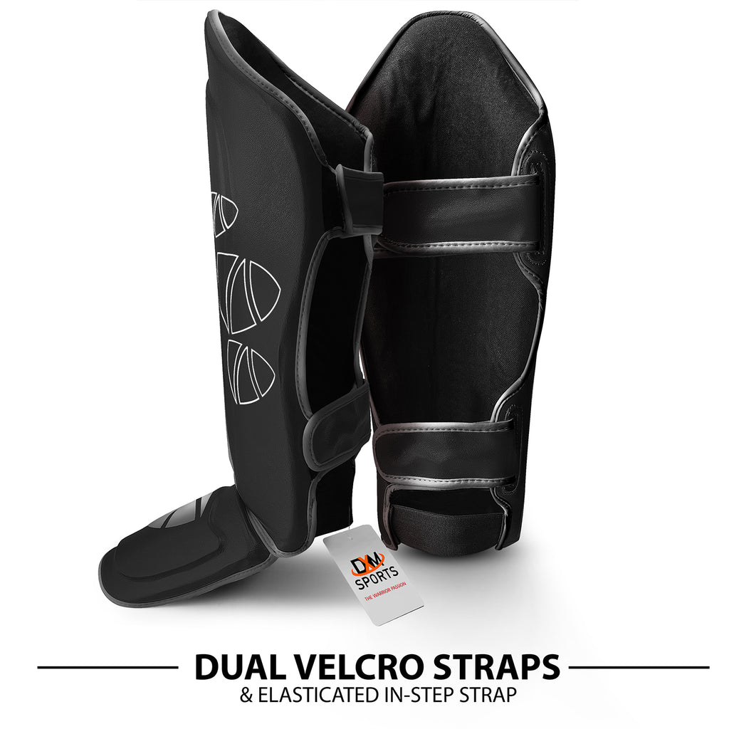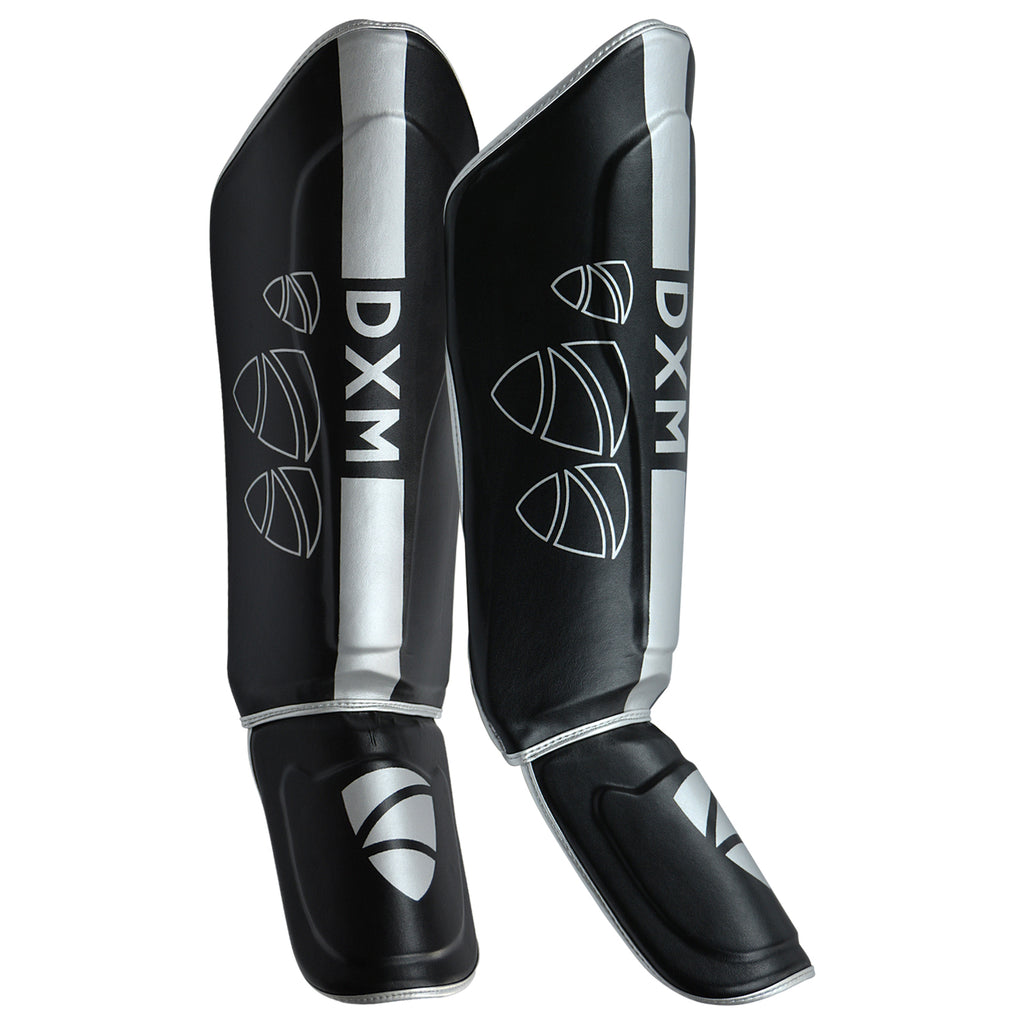 Espinilleras DXM Sports Empeine Negro/Plata Para artes marciales MMA, equipo de entrenamiento de combate, BJJ Karate Boxeo Taekwondo