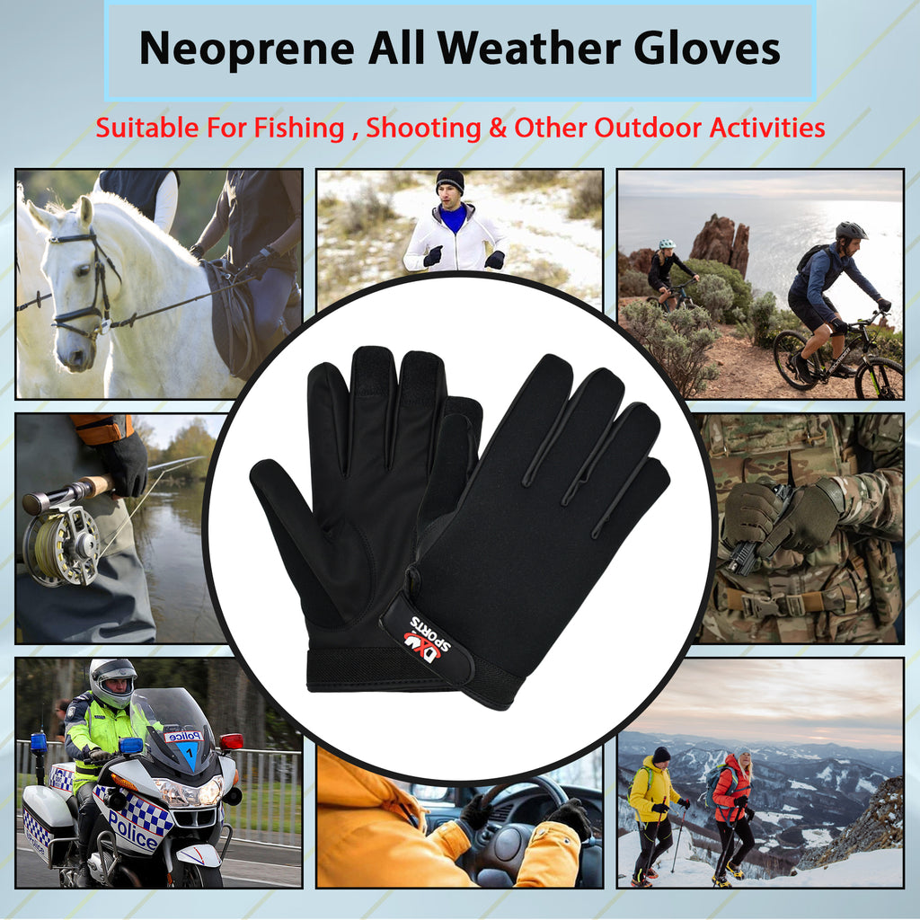 DXM Sports offers Neoprene All Weather Gloves, Kevlar lined for shooting, duty, police, pat down, and motorcycle riding, providing superior control, stability, and safety for men. The product features DuPont™ KEVLAR® fibers for cut and flame-resistant protection, a synthetic leather palm for maximum sensitivity, a breathable Neoprene back, an adjustable cuff closure, and non-slip texture on fingertips. This comprehensive lineup of foul-weather and performance gear offers maximum comfort and maneuverability in any weather, making it an excellent year-round glove for general duty, especially in wet weather.