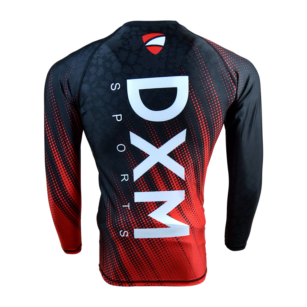 DXM SPORTS Rash Guard Mens Long Sleeve Compression Shirt - Sublimation Printed MMA Rashguard Shirt Athletic Undershirts Dry Fit Baselayer for Sports, BJJ Fight Wear No Gi Training Shirts - Black/Red